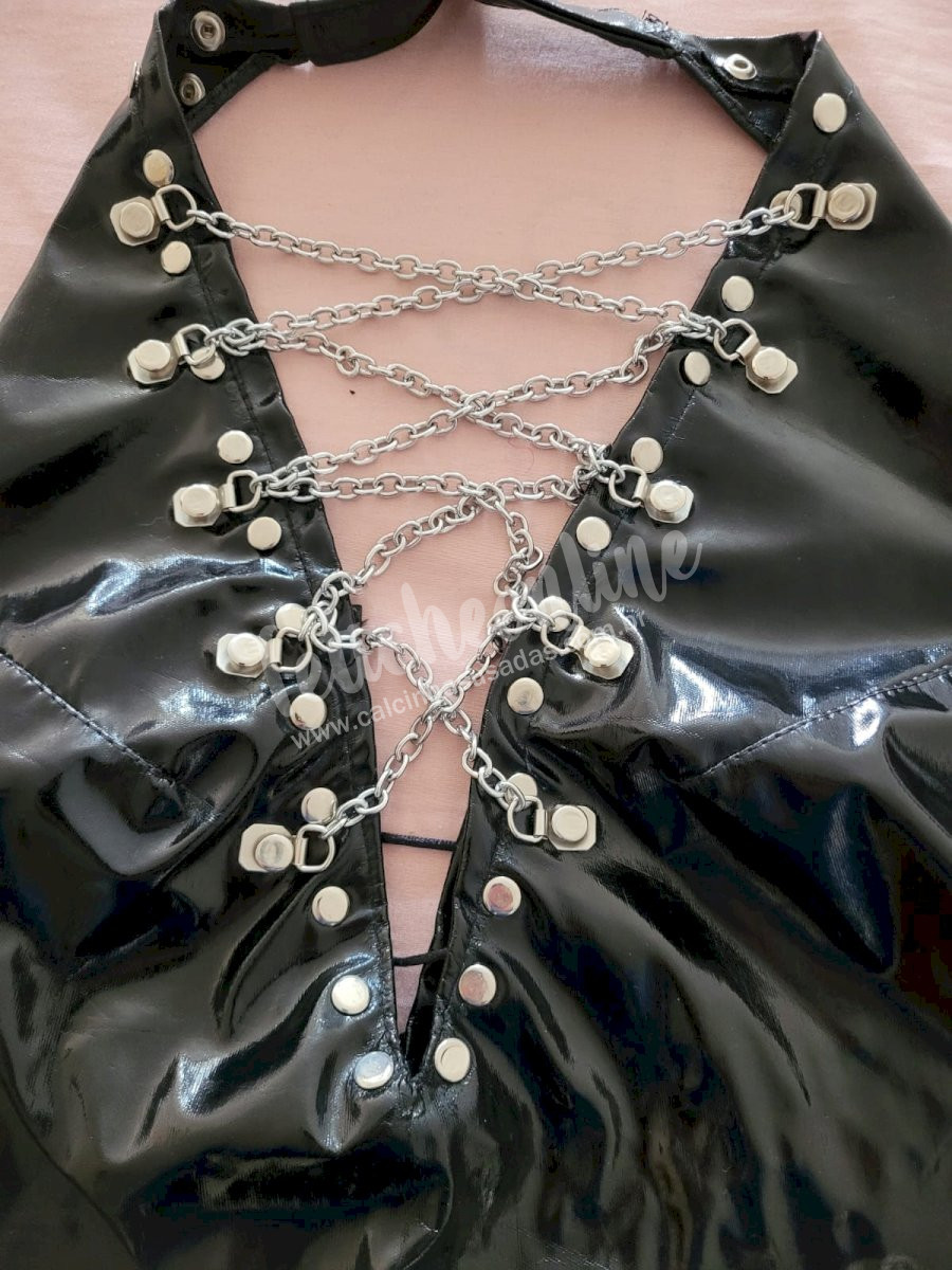 Amarração no pescoço, fecho entre as penas ajustavel, detalhes para amarrar nas costas.