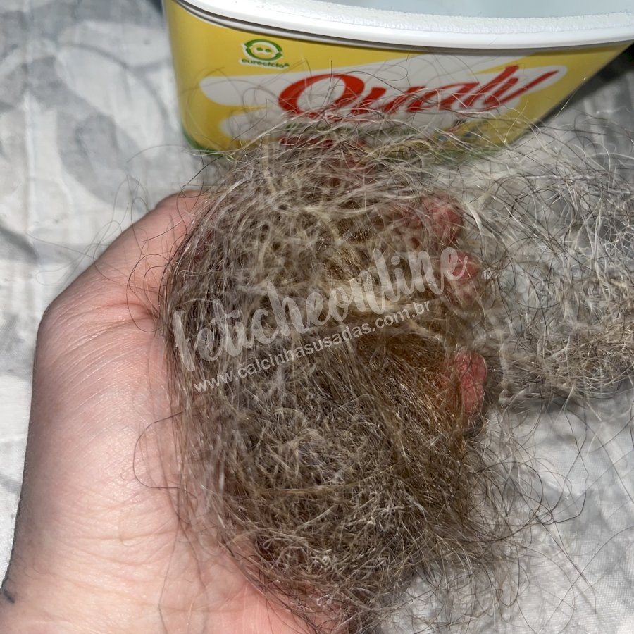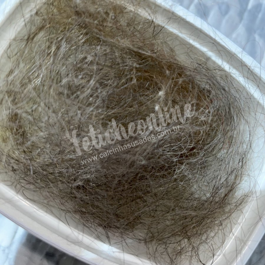 Pote de margarina médio cheio de cabelo da cabeça tirados da escova e do ralo ao lavar.