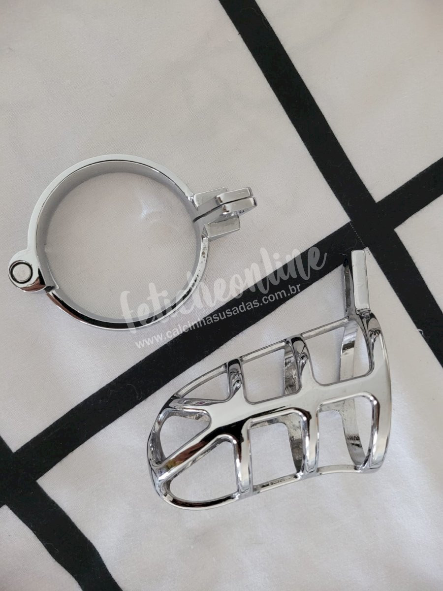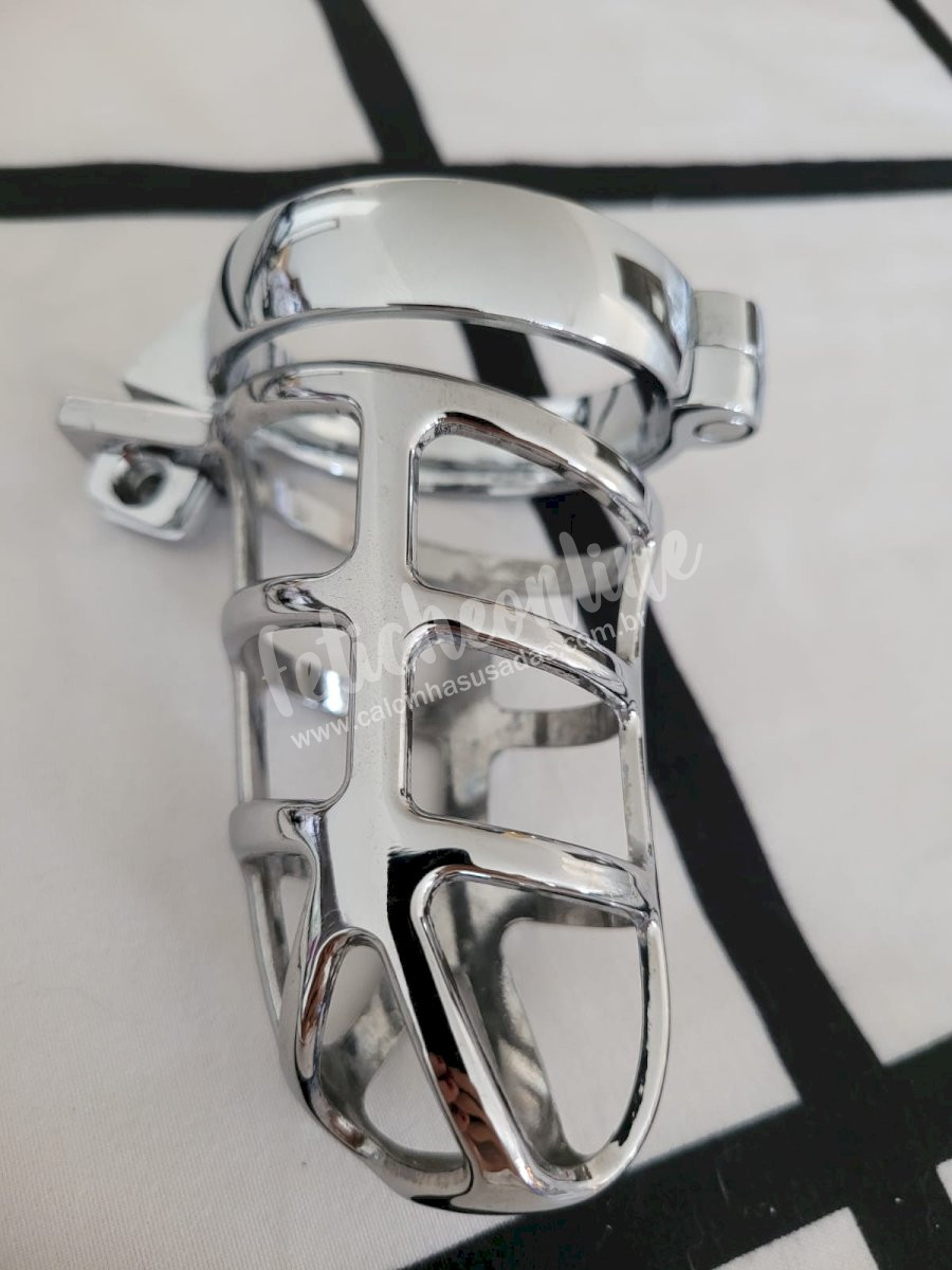 Este é um cinto de castidade masculino vazado, com argola para escroto, detalhes de grade e todo confeccionado em aço inoxidável de alta qualidade.